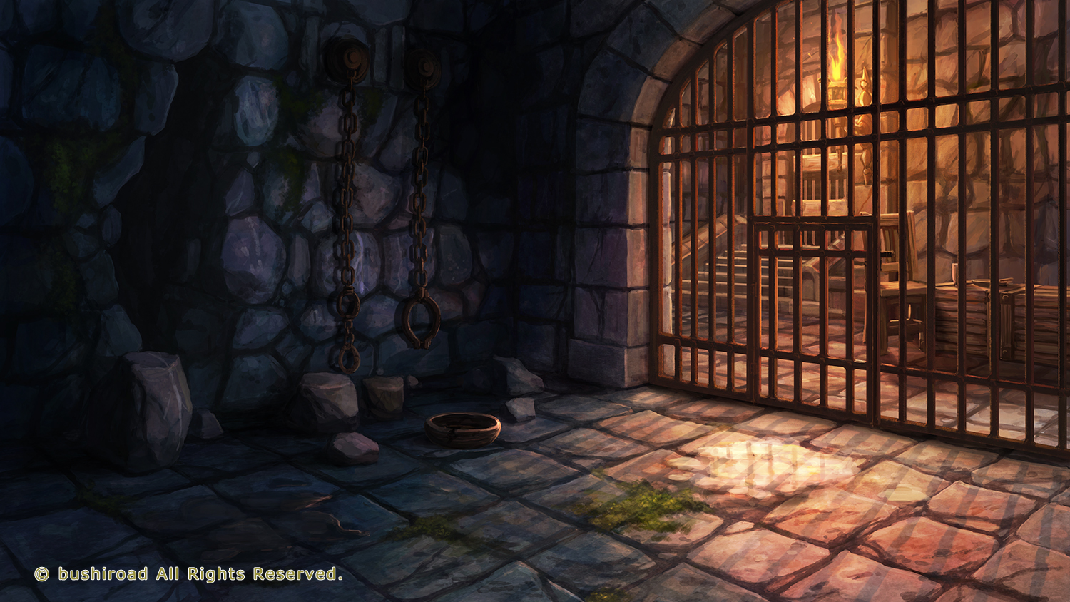 bars bowl chain chair company_name crate cuffs door dungeon fantasy granadia_saga hole_in_wall indoors moss no_humans official_art prison puddle rock scenery shackles shadow shiki_makoto stairs stone_floor stone_wall torch wall watermark
