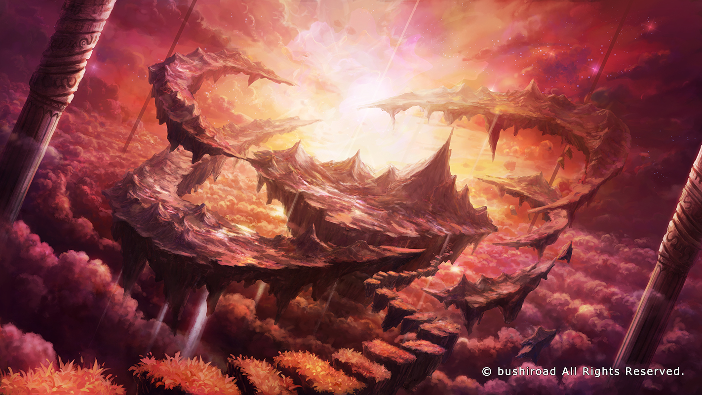 above_clouds cloud fantasy floating_island granadia_saga grand_scale grass mountain no_humans official_art pillar red_sky scenery shiki_makoto sky star_(sky) starry_sky sunlight tagme watermark