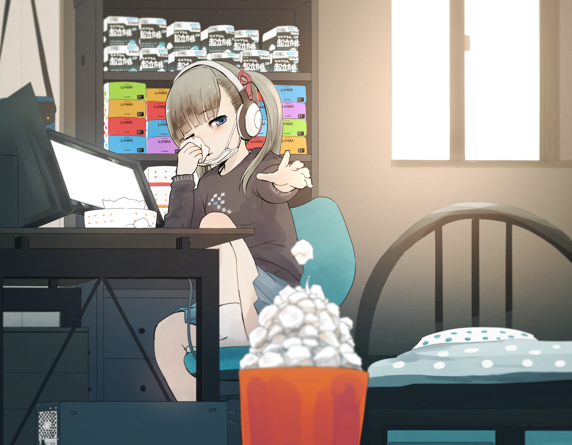 1girl bad_id bad_pixiv_id black_shirt blue_eyes blue_skirt blunt_bangs blurry bookshelf chair child computer depth_of_field eyebrows female_focus hair_ribbon hand_up headphones highres indoors light_brown_hair long_hair long_sleeves mask miniskirt monitor mouth_mask office_chair original outstretched_arm pleated_skirt red_ribbon ribbon samidare_(hoshi) shirt sick sitting skirt slice_of_life socks solo surgical_mask swivel_chair table tears throwing tissue tissue_box trash_can twintails used_tissue white_socks window wiping_nose