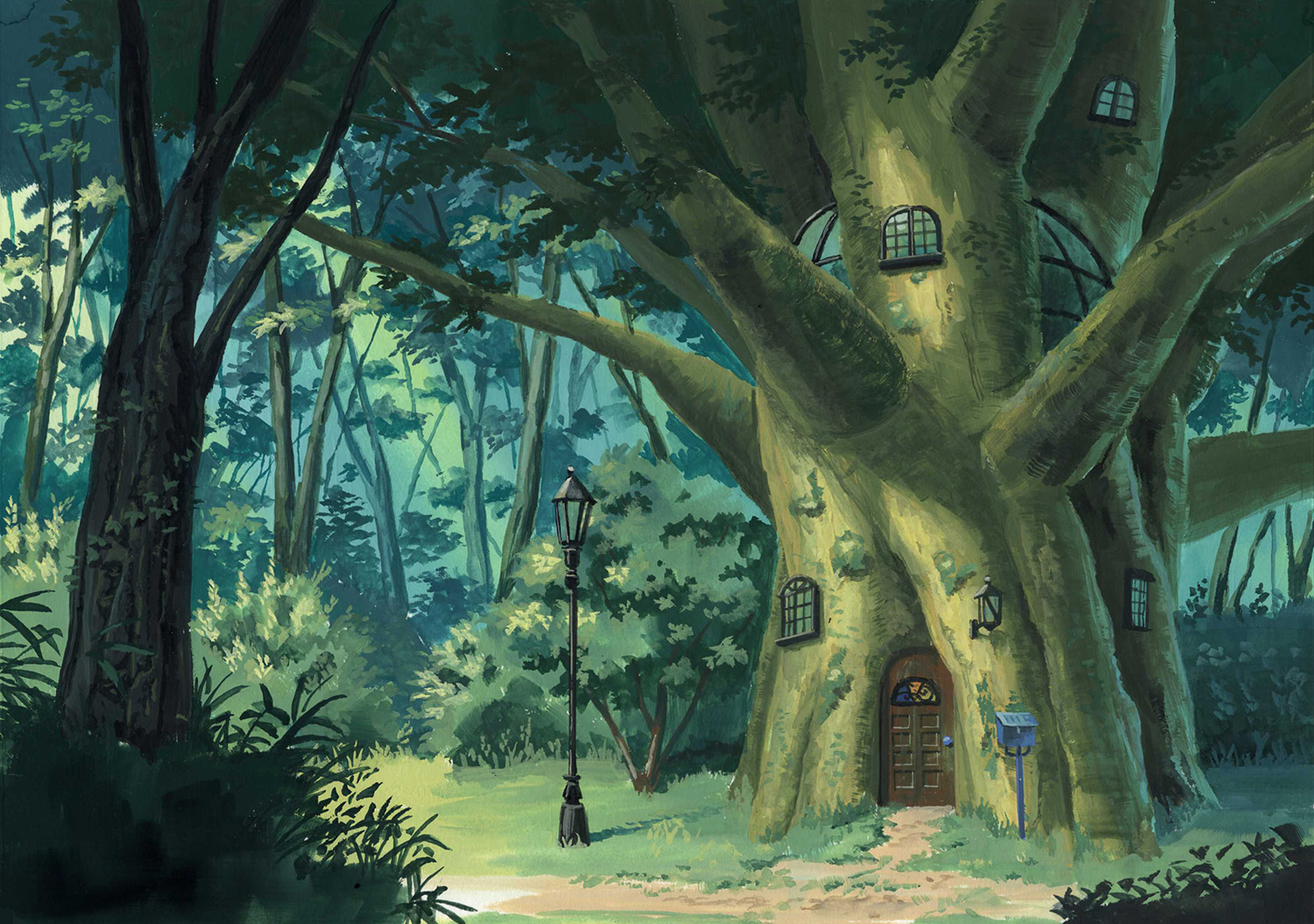 birijian bush calligraphy_brush_(medium) commentary_request day door graphite_(medium) grass lamp lamppost mailbox_(incoming_mail) nature no_humans outdoors scenery touhou traditional_media tree treehouse window