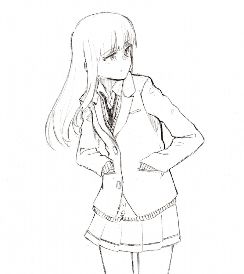 1girl blazer commentary_request female_focus graphite_(medium) greyscale hands_in_pockets jacket katou_asuka long_hair looking_to_the_side monochrome necktie pensive shiratama_(hockey) sketch solo traditional_media watashi_ga_motenai_no_wa_dou_kangaetemo_omaera_ga_warui!