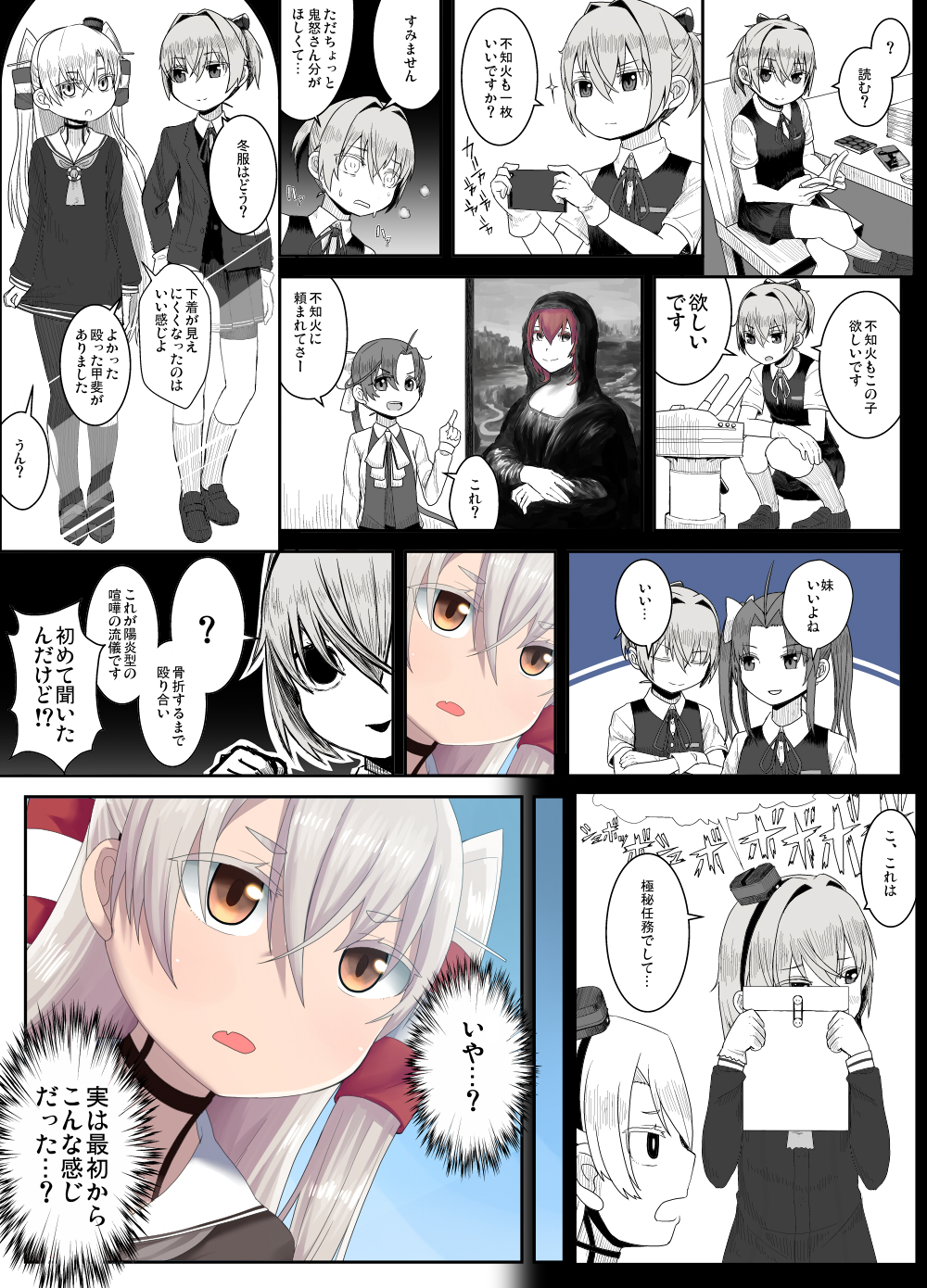 4girls :d :| ? adapted_costume ahoge akigumo_(kancolle) alternate_hairstyle alternate_legwear amatsukaze_(kancolle) amatsukaze_(kancolle)_(cosplay) arm_at_side bike_shorts black_choker blush book book_stack bow bowtie breast_pocket brown_eyes butajima_john buttons chair choker closed_eyes closed_mouth collared_shirt colored_eyelashes comic cosplay covering_face crossed_arms crossed_bangs crossed_legs dress dress_shirt eyes_visible_through_hair fine_art_parody formal_clothes gloves grey_hair grey_neckwear hair_between_eyes hair_bow hair_down hair_intakes hair_ornament hair_tubes hand_up hands_up hat headgear highres holding holding_book index_finger_raised innertube jacket kagerou_(kancolle) kantai_collection loafers long_sleeves looking_away looking_to_the_side medium_hair mini_hat mona_lisa multiple_girls neck_ribbon neckerchief open_book open_mouth outline pantyhose parody partially_colored pleated_dress pleated_skirt pocket ponytail red_hair rensouhou-kun ribbed_legwear ribbon sailor_dress school_uniform shiranui_(kancolle) shirt shoes short_ponytail short_sleeves shorts shorts_under_skirt sidelocks single_glove sitting skirt smile sound_effects sparkle speech_bubble spoken_question_mark squatting suit sweat swim_ring table taking_picture translation_request twintails two_side_up v-shaped_eyebrows vest waistcoat white_outline wing_collar