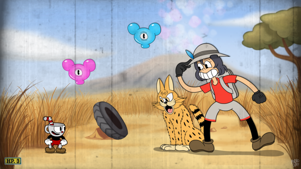10s 1boy 2girls andro_juniarto animalization backpack bag black_gloves black_legwear brown_footwear cellien_(kemono_friends) crossover cuphead cuphead_(game) drinking_straw fake_screenshot gameplay_mechanics gloves hat_feather health_bar helmet kaban_(kemono_friends) kemono_friends multiple_girls outdoors pantyhose pantyhose_under_shorts parody personification pith_helmet red_shirt red_shorts retro_artstyle serval_(kemono_friends) shirt short_hair shorts standing style_parody t-shirt teeth toon_(style) video_game wavy_hair