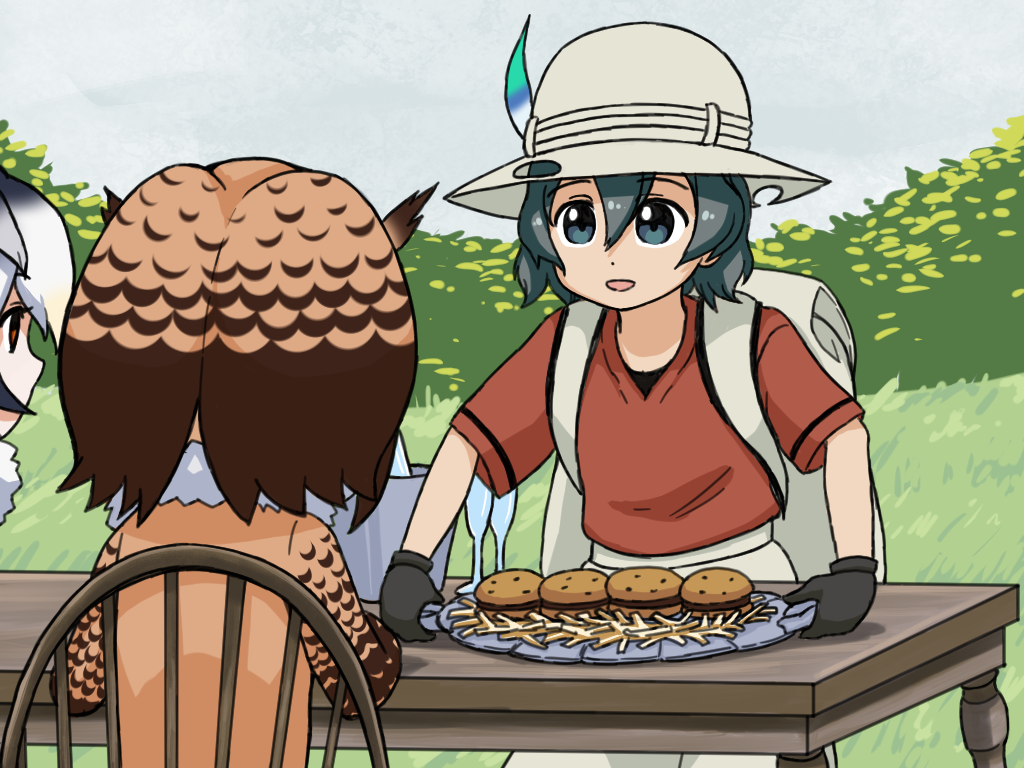 10s 3girls :d backpack bag black_eyes black_gloves black_hair brown_eyes bucket burger day drawfag eurasian_eagle_owl_(kemono_friends) food french_fries fur_collar gloves grass grey_hat hair_between_eyes hat hat_feather head_wings helmet holding kaban_(kemono_friends) kemono_friends long_sleeves looking_at_another meme multiple_girls northern_white-faced_owl_(kemono_friends) open_mouth outdoors pith_helmet red_shirt shirt short_hair short_sleeves sitting smile standing steamed_hams_(meme) the_simpsons tray wings
