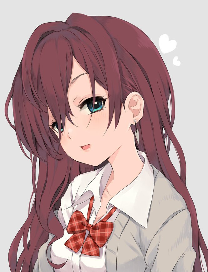 1girl blue_eyes bow bowtie brown_hair cardigan commentary_request earrings female_focus heart ichinose_shiki idolmaster idolmaster_cinderella_girls jewelry kirarin369 long_hair looking_at_viewer loose_bowtie off_shoulder open_cardigan open_clothes open_mouth plaid_bow plaid_bowtie plaid_clothes plaid_neckwear shirt simple_background smile solo upper_body wavy_hair