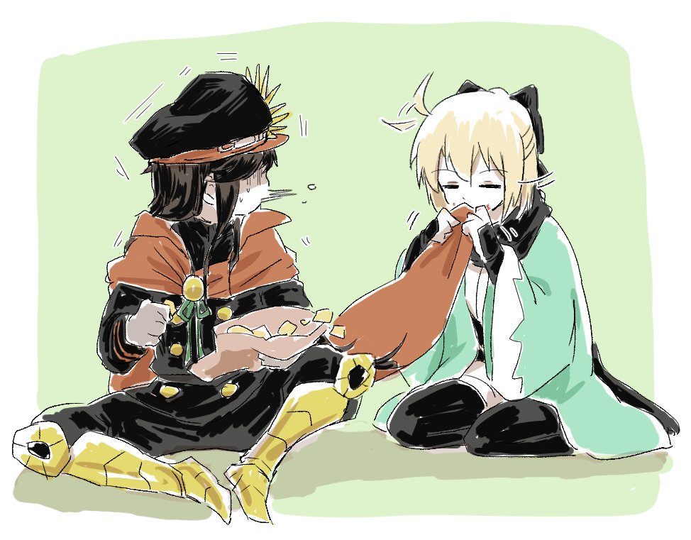 2girls bag black_hair blonde_hair bow cape chips_(food) closed_eyes fate_(series) food hair_bow haori hat holding holding_unworn_cape holding_unworn_clothes japanese_clothes koha-ace long_hair long_sleeves looking_at_another multiple_girls nejikyuu oda_nobunaga_(fate) oda_nobunaga_(koha-ace) okita_souji_(fate) okita_souji_(koha-ace) okita_souji_(third_ascension)_(fate) red_cape short_hair sitting spit_take spitting unworn_cape wide_sleeves wiping_mouth