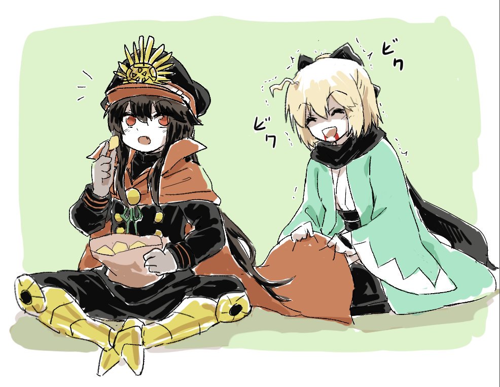 2girls arrow_(symbol) bag black_hair blonde_hair blood blood_from_mouth bow cape chips_(food) fang fate_(series) food hair_bow hat holding holding_unworn_cape holding_unworn_clothes koha-ace long_hair multiple_girls nejikyuu oda_nobunaga_(fate) oda_nobunaga_(koha-ace) okita_souji_(fate) okita_souji_(koha-ace) okita_souji_(third_ascension)_(fate) open_mouth red_cape short_hair sitting unworn_cape