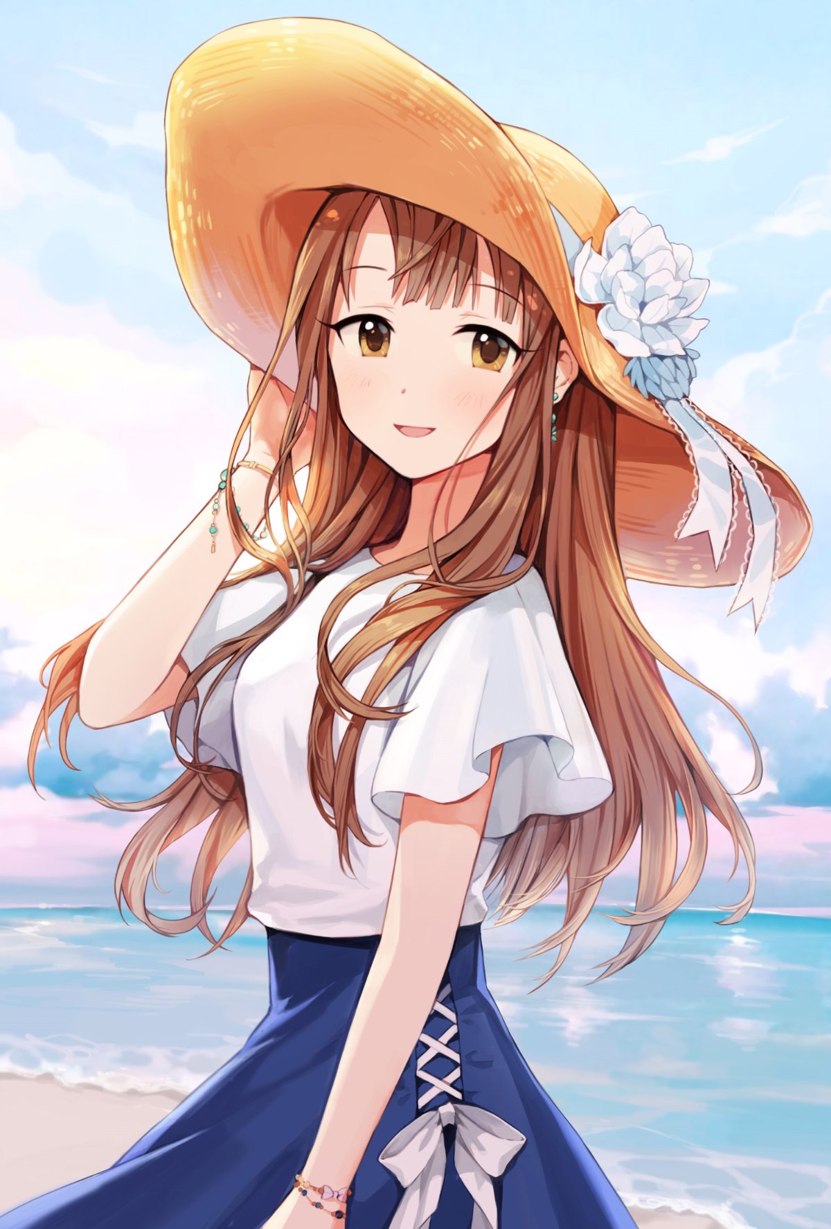 1girl beach blouse bow bracelet brown_eyes brown_hair cloud earrings female_focus flower hat hat_flower hat_ribbon high-waist_skirt highres idolmaster idolmaster_cinderella_girls jewelry long_hair looking_at_viewer mizumoto_yukari ocean open_mouth outdoors pinkiepies2 ribbon shirt skirt sky smile solo sun_hat water