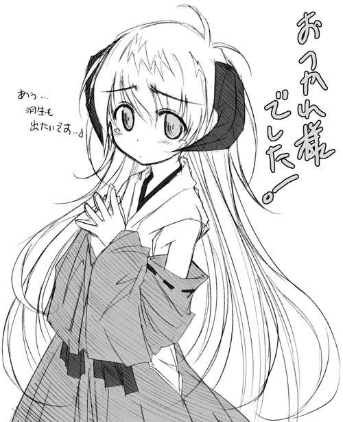 00s greyscale hanyuu higurashi_no_naku_koro_ni horns japanese_clothes long_hair miko monochrome solo translation_request yumesato_makura