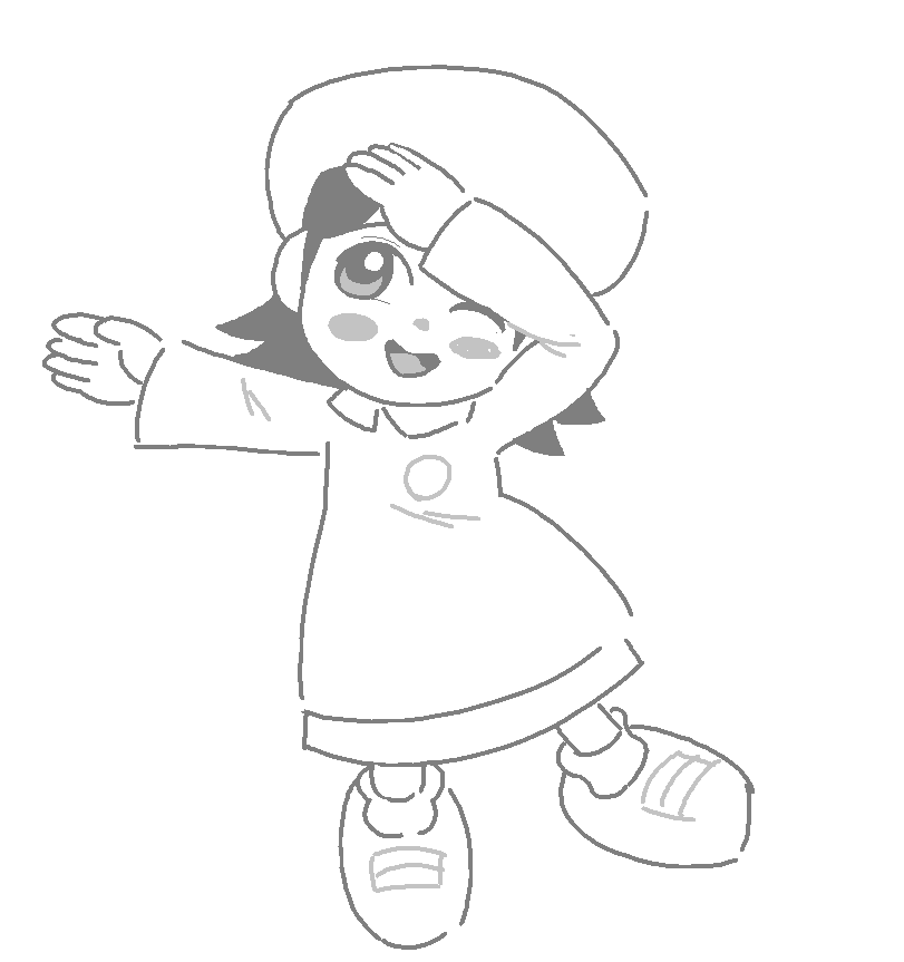 1girl adeleine blush_stickers buttons collared_shirt dab_(dance) drawfag female_focus full_body greyscale hat kirby_(series) kirby_64 leg_up long_sleeves monochrome nintendo one_eye_closed shirt smile solo tagme