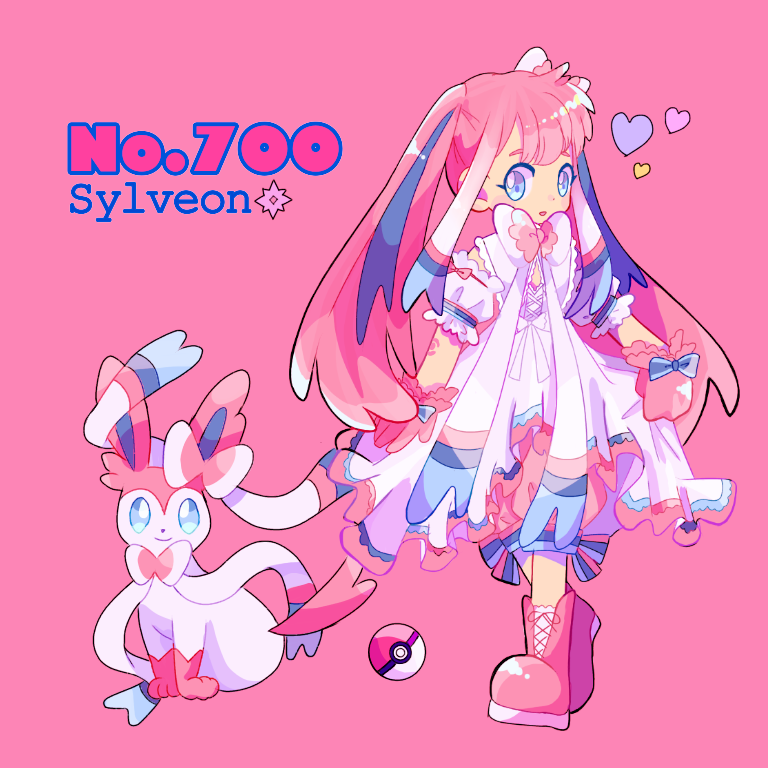 1girl arm_garter bad_id bad_pixiv_id bloomers blue_bow blue_eyes blush blush_stickers boots bow character_name child corset creature_and_personification dress english_text female_focus flat_chest frilled_dress frills full_body gen_6_pokemon gloves hair_bow hair_ornament happy heart long_hair looking_at_viewer multicolored_hair narumame nintendo open_mouth personification pink_background pink_bloomers pink_boots pink_gloves pink_hair poke_ball poke_ball_(basic) pokedex_number pokemon pokemon_(creature) simple_background sitting sleeveless sleeveless_dress smile socks standing sylveon text_focus twintails underwear white_bow white_dress white_legwear white_neckwear