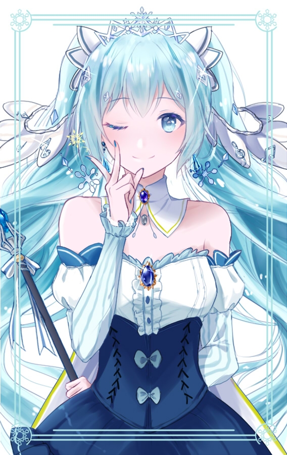 ;) arm_behind_back blue_eyes blue_hair blue_nails choker detached_sleeves diadem floating_hair hatsune_miku holding holding_staff long_hair nail_polish one_eye_closed osage_(osage8545675) smile solo staff strapless twintails very_long_hair vocaloid yuki_miku