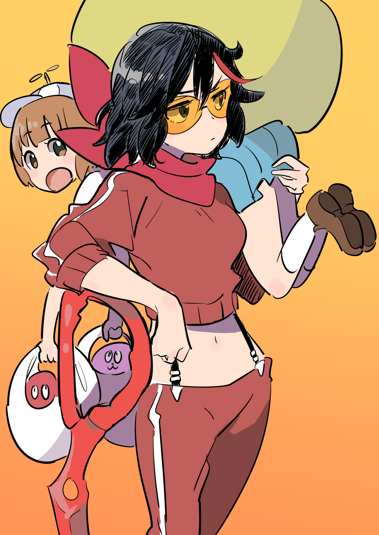 2girls :3 bad_id bad_pixiv_id bag black_hair blue_skirt brown_eyes brown_footwear brown_hair gradient_background hat highres holding holding_bag kill_la_kill looking_back mankanshoku_mako matoi_ryuuko multicolored_hair multiple_girls musshu_(omu001) open_mouth orange_background peaked_cap red_hair red_scarf scarf scissor_blade_(kill_la_kill) shoes short_hair skirt socks sunglasses two-tone_hair white_legwear