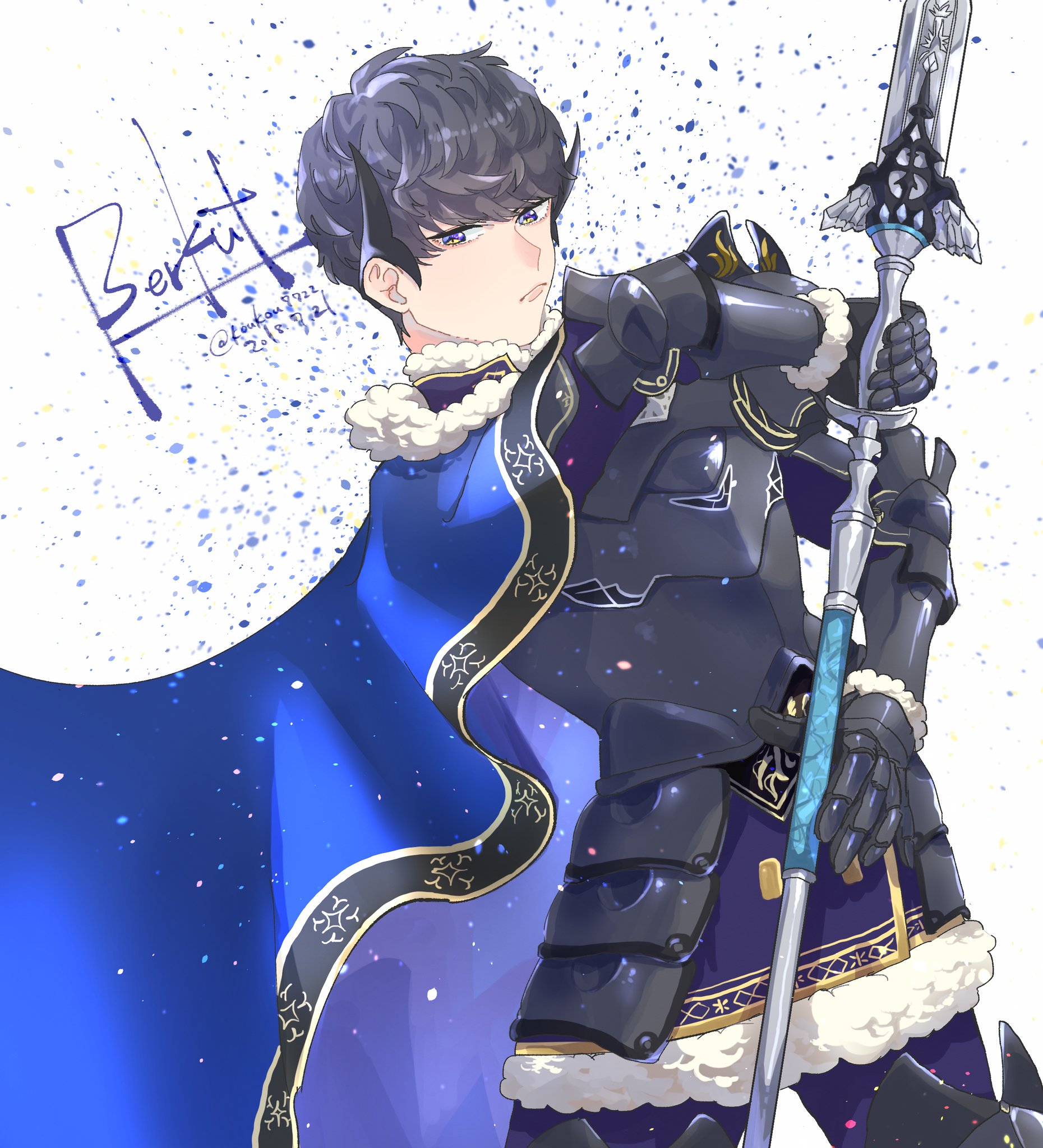 1boy armor berkut_(fire_emblem) berkut_(soiree)_(fire_emblem) black_hair blue_eyes cape fire_emblem fire_emblem_echoes:_shadows_of_valentia fire_emblem_gaiden fire_emblem_heroes gauntlets highres holding holding_polearm holding_spear holding_weapon looking_back male_focus nerinriume nintendo polearm pout solo spear weapon