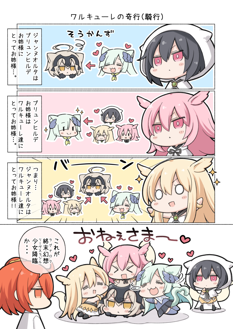 6+girls :< :3 ahoge animal_ears animal_hood aqua_hair black_hair blonde_hair bracelet brynhild_(fate) cat_ears cat_girl cat_tail closed_eyes comic dress energy_wings fate/grand_order fate_(series) fujimaru_ritsuka_(female) fur_collar hair_between_eyes hand_on_own_chin head_wings heart hildr_(fate) hood hooded_robe jeanne_d'arc_(fate) jeanne_d'arc_alter_(avenger)_(fate) jeanne_d'arc_alter_(fate) jewelry kemonomimi_mode multiple_girls nejikirio o_o orange_eyes orange_hair ortlinde_(fate) parted_bangs pink_eyes pink_hair robe short_hair sparkle standing tail thrud_(fate) valkyrie valkyrie_(fate) white_dress white_robe wings yellow_eyes