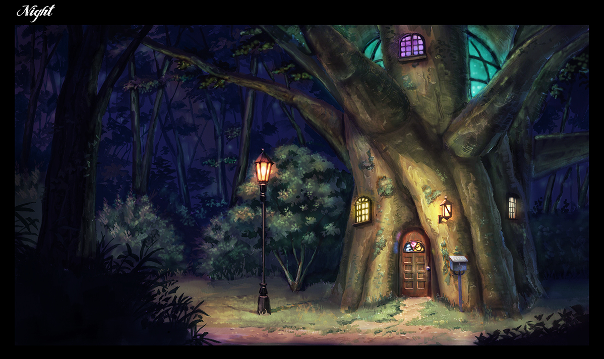 birijian black_border border bush calligraphy_brush_(medium) commentary_request door graphite_(medium) grass lamp lamppost mailbox_(incoming_mail) nature night no_humans outdoors scenery touhou traditional_media tree treehouse window