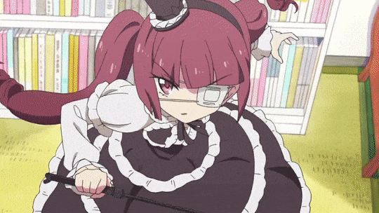 2girls animated animated_gif arms_up blonde_hair board book bookshelf carpet catching chopping convenient_censoring cutting_board eyepatch gothic_lolita convenient_hair hanazono_yurine hat indoors jashin-chan jashin-chan_dropkick lamia lolita_fashion mini_hat monster_girl multiple_girls on_table red_eyes red_hair snake_tail table tail violence
