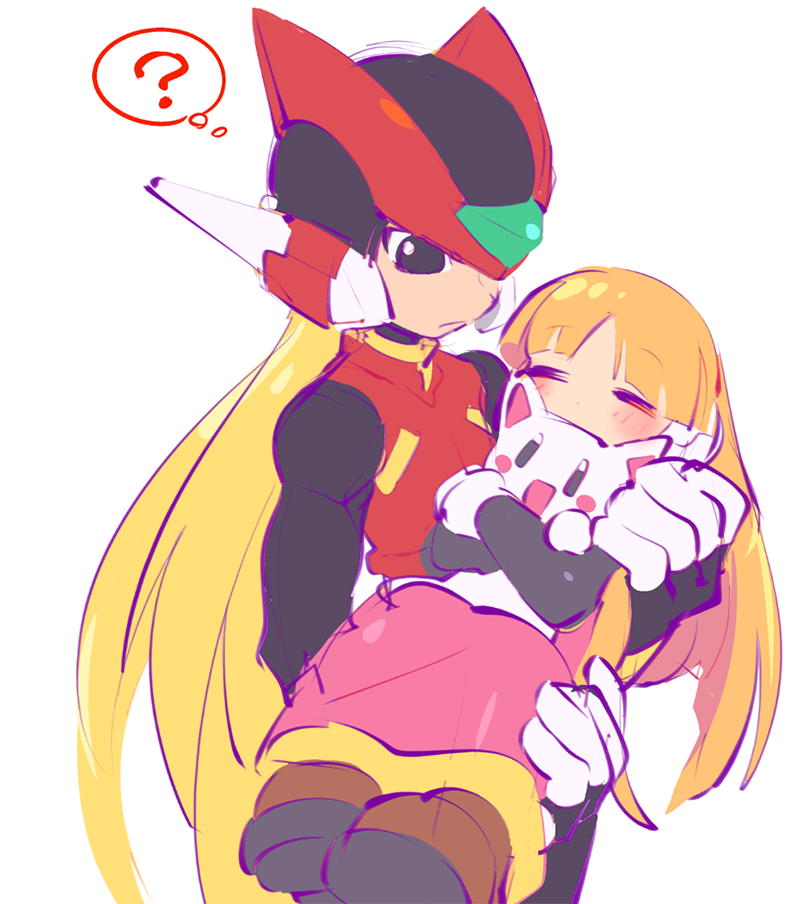 1boy 1girl ? alouette_(mega_man) android black_eyes blonde_hair blunt_bangs blush blush_stickers brown_footwear carrying cat child closed_eyes gloves helmet holding hugging_doll hugging_object kon_(kin219) long_hair mega_man_(series) mega_man_zero_(series) princess_carry robot_ears simple_background sleeping stuffed_animal stuffed_toy white_background zero(z)_(mega_man) zero_(mega_man)