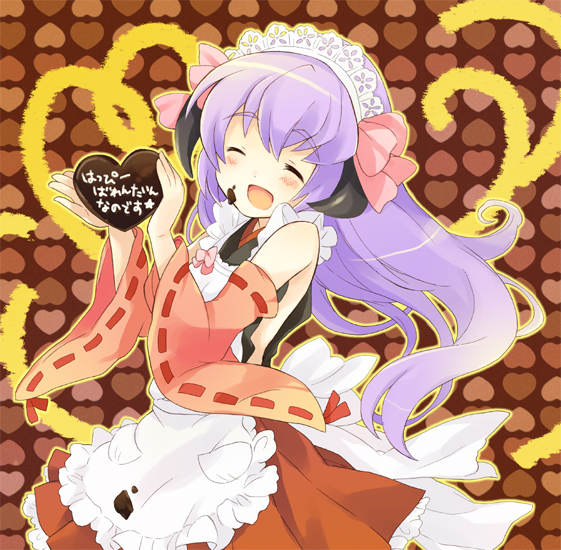 00s 1girl apron chocolate closed_eyes detached_sleeves female_focus hakama hakama_skirt hanyuu happy_valentine higurashi_no_naku_koro_ni horns japanese_clothes long_hair maid maid_apron purple_hair red_hakama skirt solo tachitsu_teto valentine wa_maid