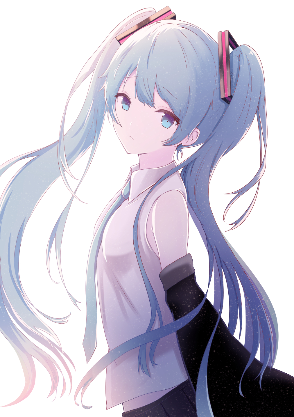 1girl bare_shoulders blue_eyes blue_hair blue_necktie closed_mouth collared_shirt detached_sleeves female_focus from_side frown hair_ornament hatsune_miku highres long_hair long_sleeves looking_at_viewer looking_to_the_side necktie shirt simple_background solo twintails upper_body very_long_hair vocaloid white_background white_shirt wide_sleeves wing_collar yuzuaji