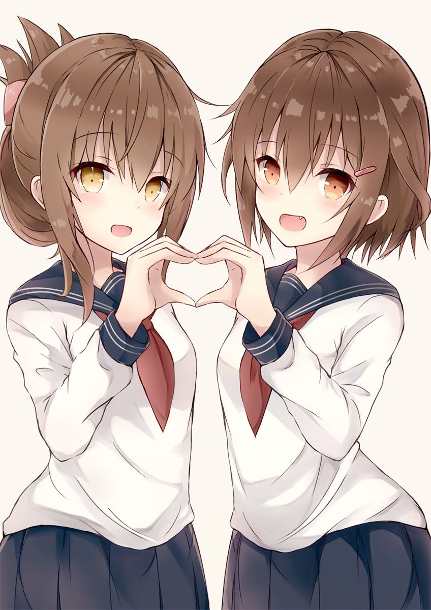 2girls black_skirt blue_serafuku blush breasts brown_eyes hair_between_eyes hair_ornament hairclip heart heart_hands highres ikazuchi_(kancolle) inazuma_(kancolle) kantai_collection long_hair long_sleeves looking_at_viewer medium_hair miniskirt multiple_girls neckerchief open_mouth red_neckerchief school_uniform serafuku simple_background skirt small_breasts white_background yuzuzukushi