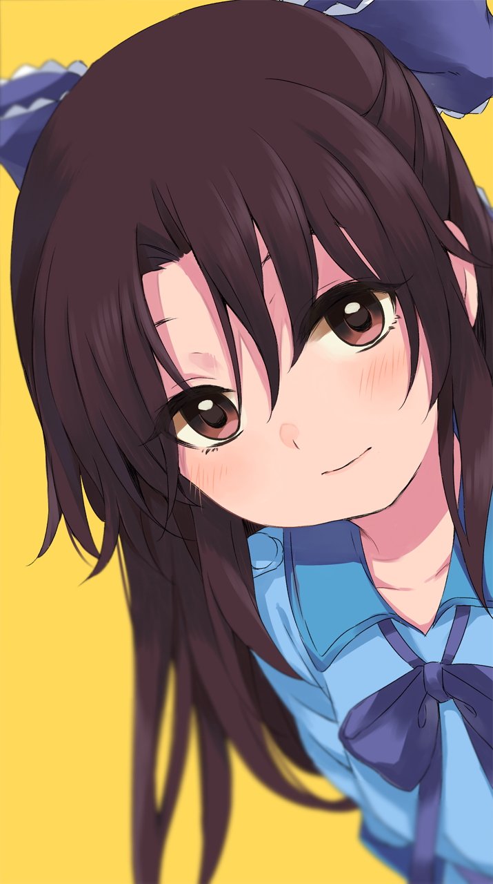 1girl blue_bow blue_bowtie blue_shirt blurry blush bow bowtie brown_eyes brown_hair collared_shirt commentary_request depth_of_field female_focus hair_bow half_updo highres idolmaster idolmaster_cinderella_girls kirarin369 long_hair looking_at_viewer parted_bangs shirt simple_background solo tachibana_arisu upper_body wing_collar yellow_background