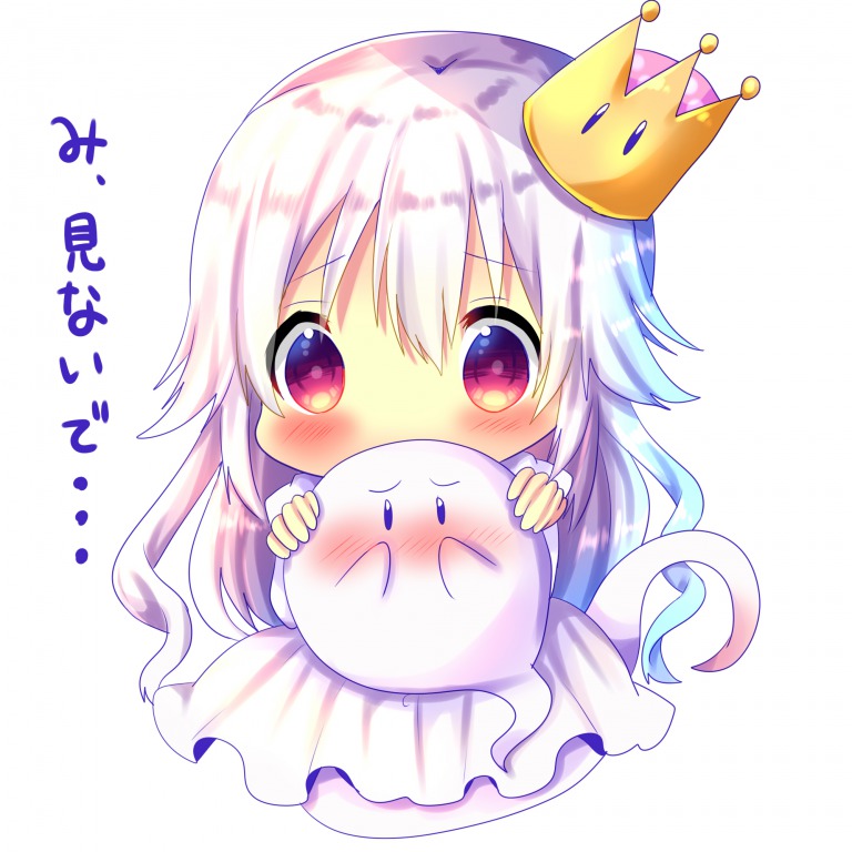 1girl blush boo_(mario) chibi chocolat_(momoiro_piano) commentary_request covered_mouth crown dress full_body ghost_tail hair_between_eyes long_hair looking_at_viewer luigi's_mansion mario_(series) mini_crown new_super_mario_bros._u_deluxe nintendo nose_blush pleated_dress princess_king_boo puffy_short_sleeves puffy_sleeves red_eyes short_sleeves silver_hair simple_background super_crown tilted_headwear translation_request very_long_hair white_background white_dress