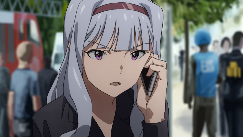 1girl alternate_costume black_jacket black_widow black_widow_(cosplay) blurry blurry_background captain_america:_civil_war captain_america_(series) captain_america_civil_war cellphone cosplay crossover day hairband holding holding_phone idolmaster idolmaster_(classic) jacket long_hair long_sleeves marvel marvel open_mouth parody phone purple_eyes purple_hairband shijou_takane silver_hair solo_focus taku1122 talking_on_phone