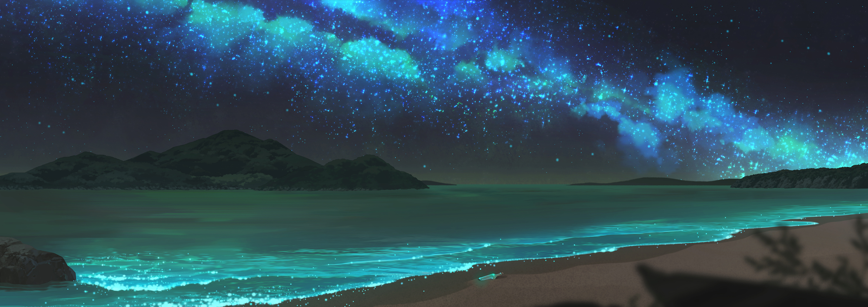 beach blurry bottle commentary_request cork depth_of_field highres horizon island milky_way mountain night no_humans ocean original outdoors plant sand scenery sennotane sky star_(sky) starry_sky