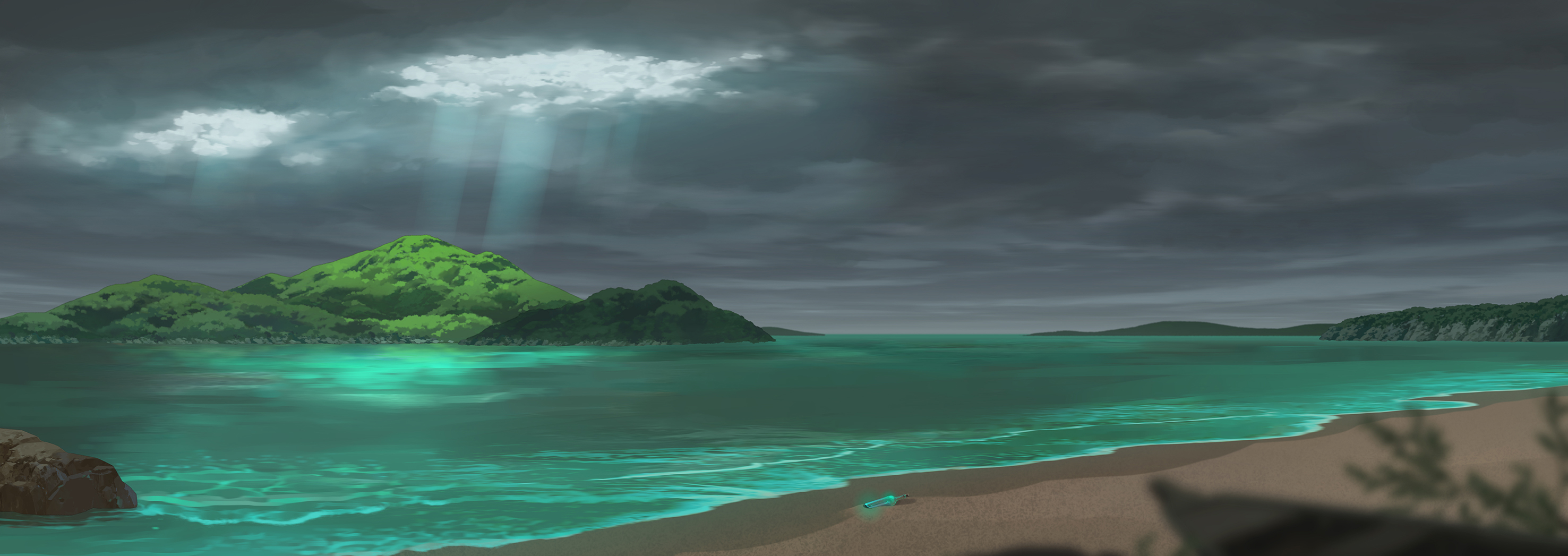 beach blurry bottle cork day depth_of_field highres horizon island mountain no_humans ocean original outdoors plant sand scenery sennotane sky