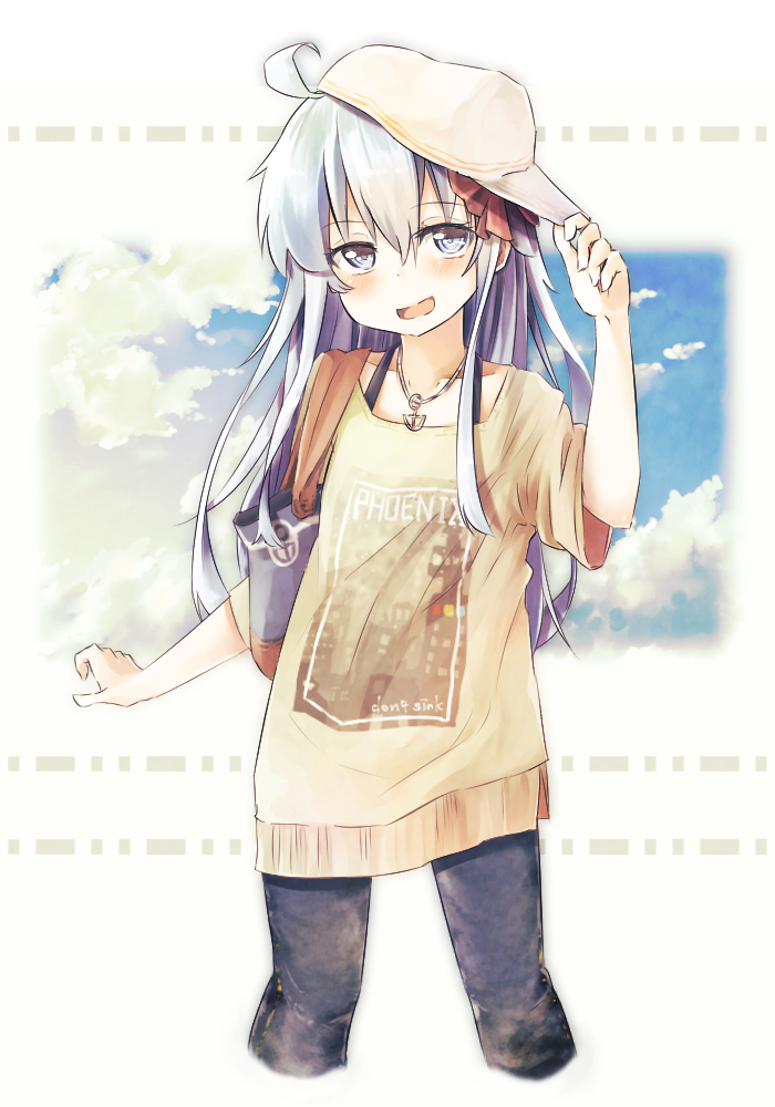 1girl ;d ahoge alternate_costume anchor_necklace arm_up bag beige_shirt black_pants blue_sky cloud commentary_request contemporary cropped_legs denim english_text female_focus flat_cap grey_eyes hair_between_eyes hair_ribbon hand_on_headwear hat hibiki_(kancolle) jeans jewelry kantai_collection long_hair looking_at_viewer necklace one_eye_closed open_mouth outstretched_leg pants pendant print_shirt red_ribbon ribbon shirt short_sleeves shoulder_bag sideways_hat silver_hair sky smile solo taisho_(gumiyuki) white_background white_hat