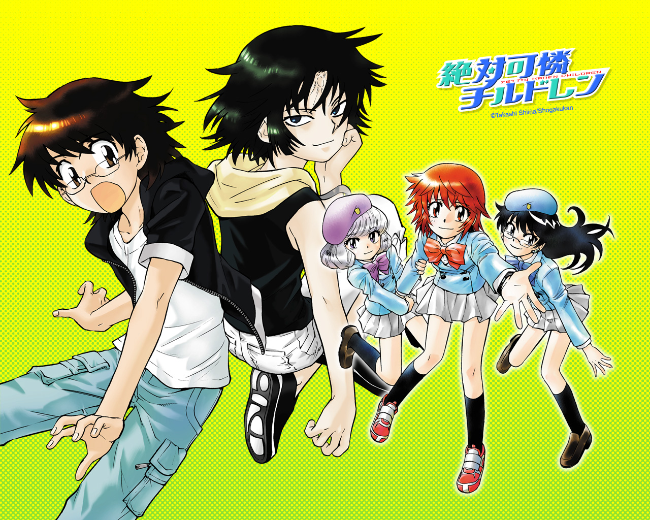 00s 2boys 3girls aged_down akashi_kaoru hyoubu_kyousuke minamoto_kouichi multiple_boys multiple_girls nogami_aoi official_art official_wallpaper sannomiya_shiho shiina_takashi zettai_karen_children