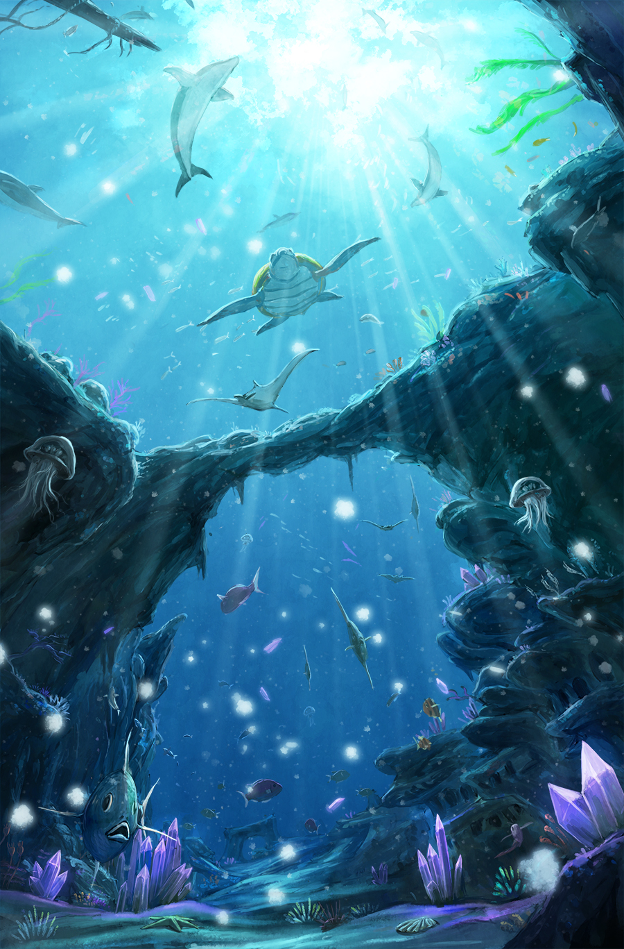 angelfish branch clam crystal day dolphin fish highres jellyfish light_rays manta_ray no_humans ocean official_art original outdoors rock scenery sea_turtle seaweed shiki_makoto starfish sunbeam sunlight tropical_fish turtle underwater water