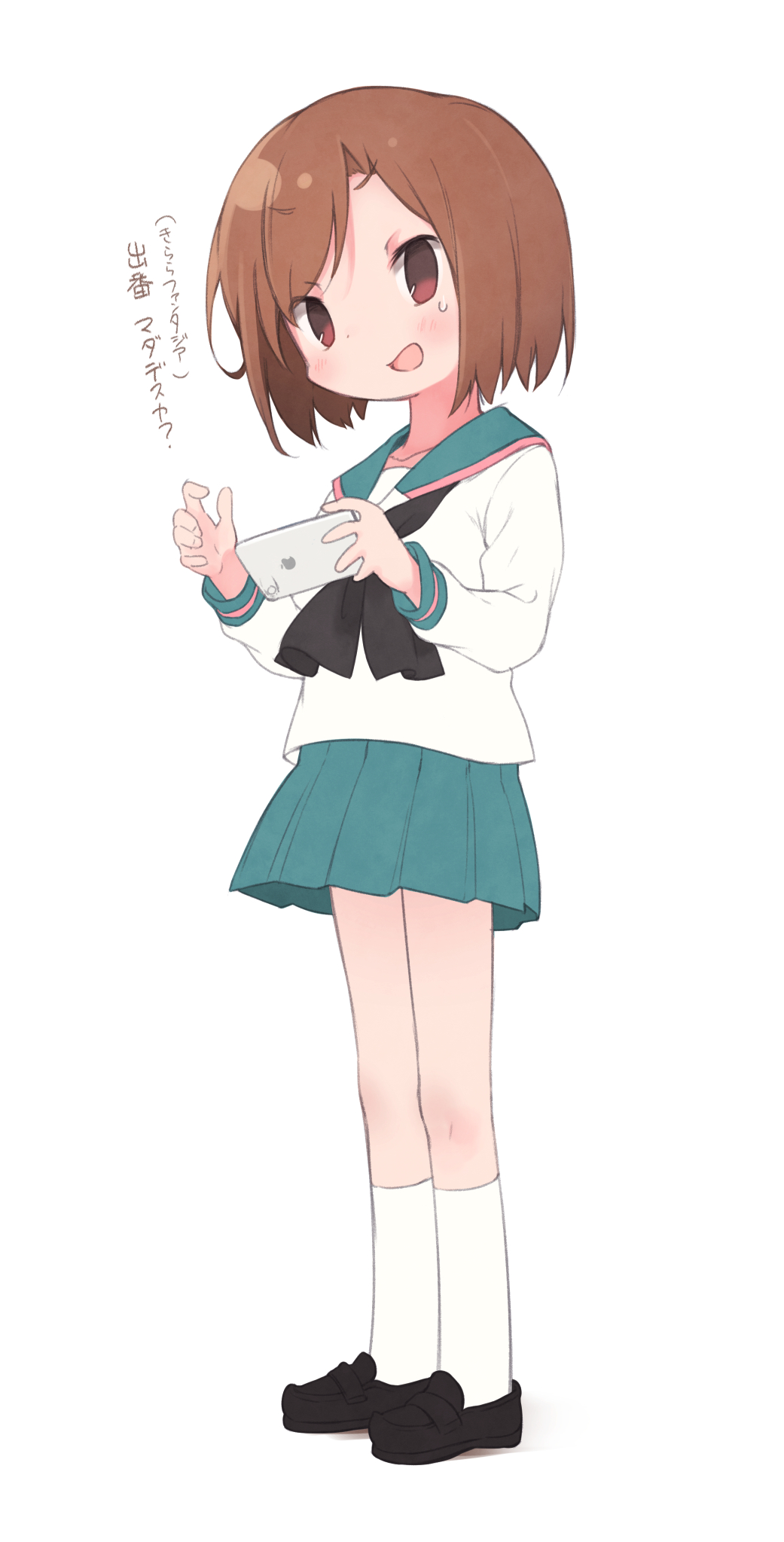 1girl a_channel black_shoes blush brown_eyes brown_hair cellphone female_focus green_skirt highres holding holding_phone imai_yutaka iphone loafers long_sleeves looking_at_viewer okayparium open_mouth phone shoes short_hair skirt smartphone smile socks solo standing translation_request white_socks