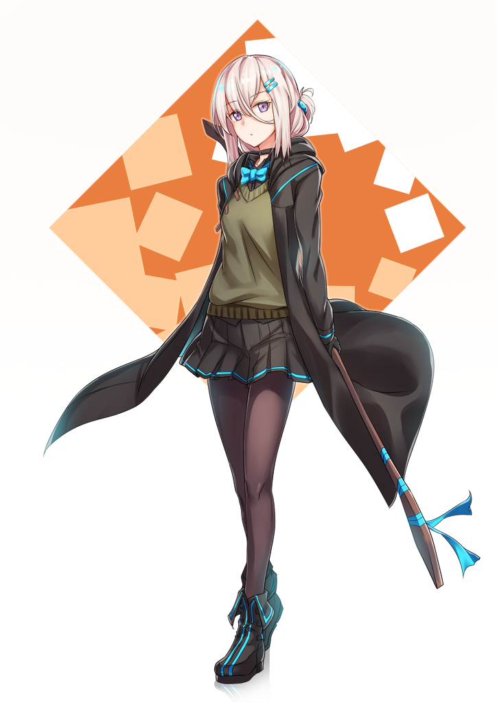 1girl ankle_boots black_boots black_choker black_coat black_gloves black_pantyhose black_skirt blue_bow blue_bowtie boots borrowed_character bow bowtie choker closed_mouth coat commentary_request female_focus folded_ponytail full_body gloves grey_hair hair_between_eyes hair_ornament hairclip holding long_sleeves medium_hair miniskirt oar open_clothes open_coat pantyhose pleated_skirt purple_eyes sasebono_mari skirt solo standing sweater_vest