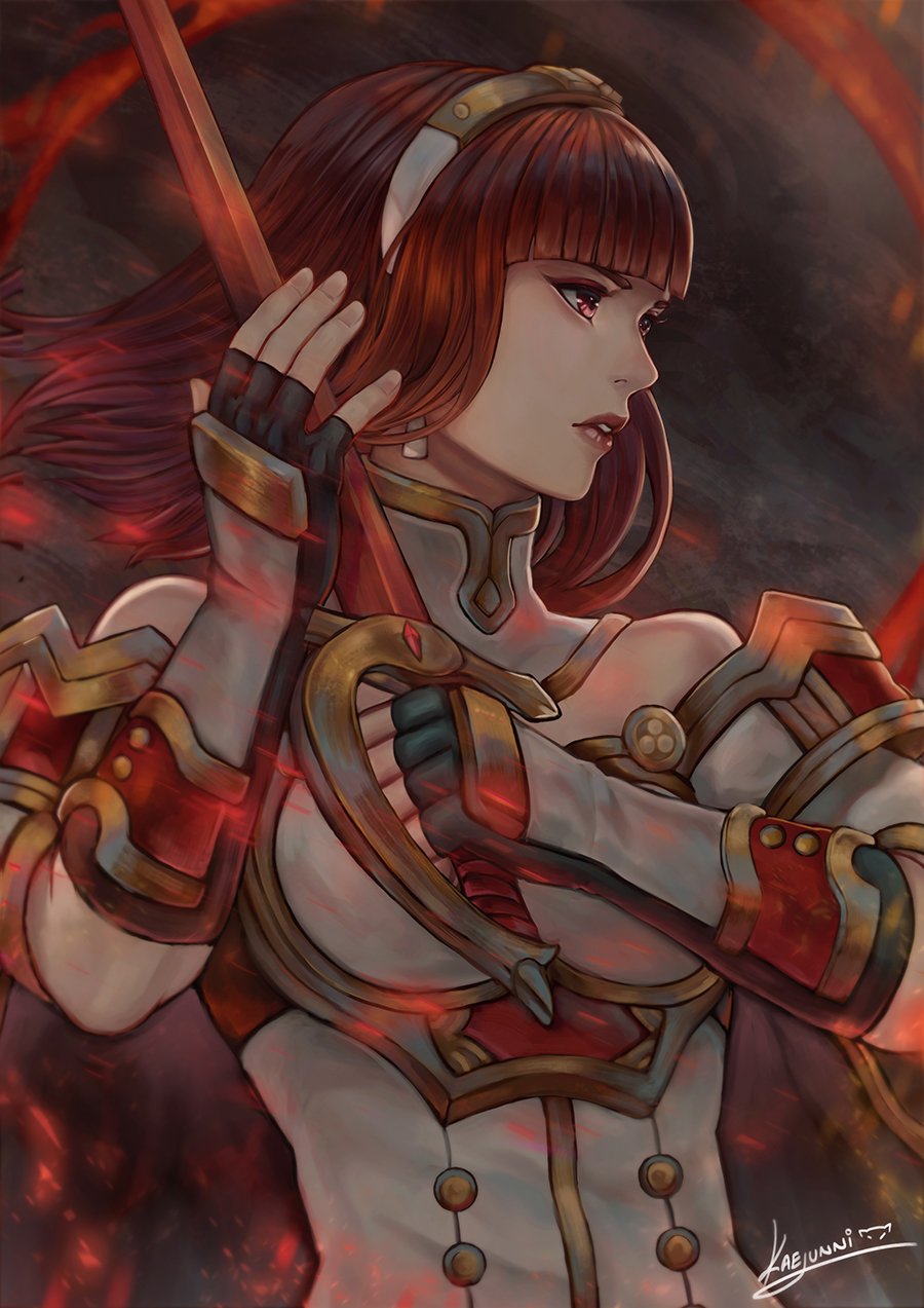 1girl armor cape celica_(fire_emblem) dress earrings female_focus fingerless_gloves fire_emblem fire_emblem_echoes:_shadows_of_valentia fire_emblem_heroes gloves highres jewelry kaejunni long_hair nintendo red_eyes red_hair solo tiara