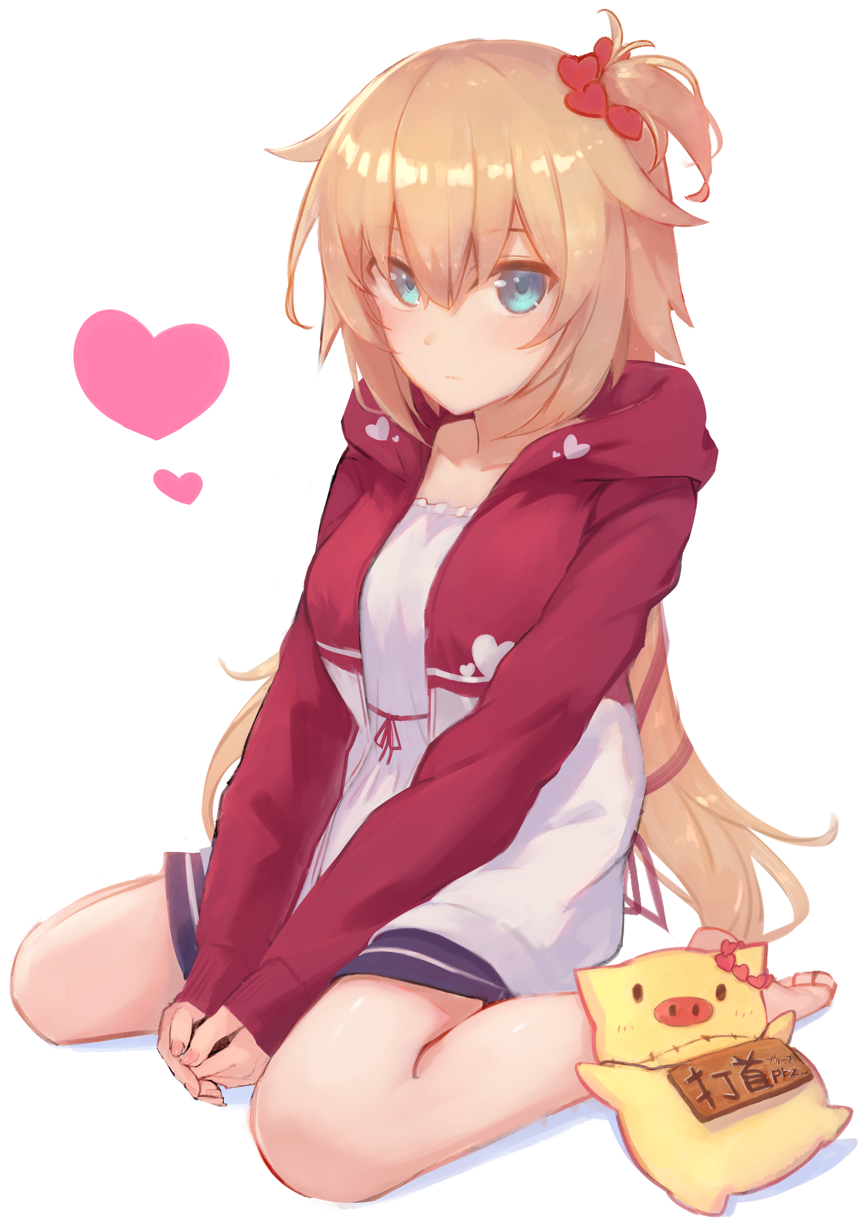1girl absurdres akai_haato akai_haato_(loungewear) blonde_hair blue_eyes blush breasts closed_mouth collarbone commentary haaton_(akai_haato) hair_ornament heart heart_hair_ornament highres hololive hood hoodie large_breasts long_sleeves looking_at_viewer low_twintails nail_polish pig pink_nails sitting stuffed_animal stuffed_pig stuffed_toy t6_ti thighs twintails virtual_youtuber