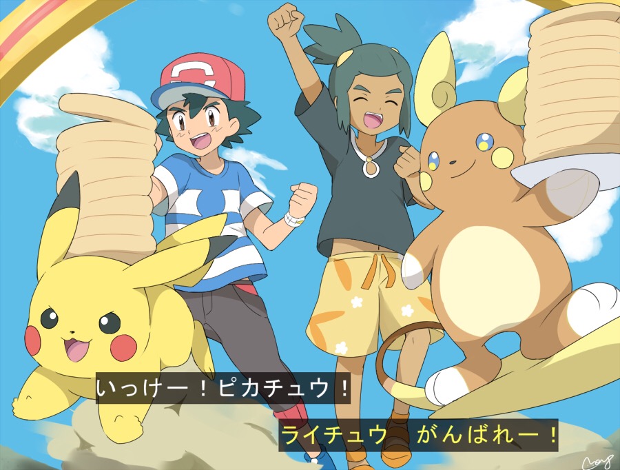 2boys :3 alolan_form alolan_raichu arm_up artist_name ash_ketchum bad_id bad_pixiv_id baseball_cap black_eyes black_hair black_pants black_shirt blue_eyes blue_footwear blue_shirt blue_sky bracelet brown_eyes clenched_hands closed_eyes closed_mouth cloud collarbone dark-skinned_male dark_skin day food gen_1_pokemon gen_7_pokemon hair_ornament hand_up hands_up happy hat hau_(pokemon) holding japanese_text jewelry jpeg_artifacts jumping legs_apart looking_at_another male_focus mei_(maysroom) midriff_peek multiple_boys navel nintendo open_mouth orange_footwear outdoors pancake pants pikachu plate pokemon pokemon_(anime) pokemon_(creature) pokemon_sm013 pokemon_sm_(anime) racing red_headwear running shirt shoes short_hair short_sleeves shorts signature sky smile standing striped_clothes striped_shirt talking teeth text_focus topknot translation_request yellow_shorts z-ring