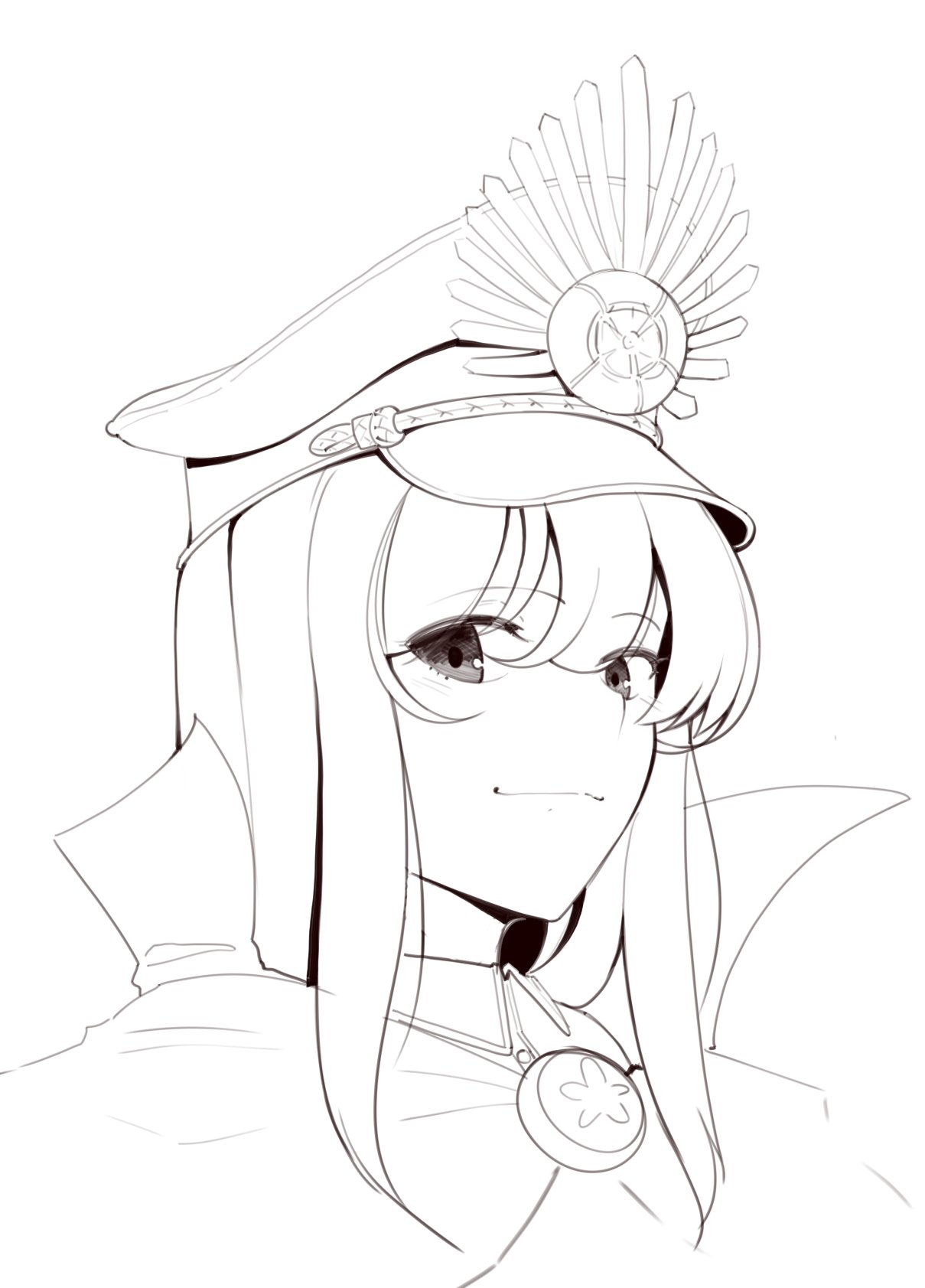 1girl boa_(brianoa) cape closed_mouth fate_(series) female_focus greyscale hat high_collar highres koha-ace long_hair looking_at_viewer monochrome oda_nobunaga_(fate) oda_nobunaga_(koha-ace) peaked_cap portrait simple_background smile solo white_background