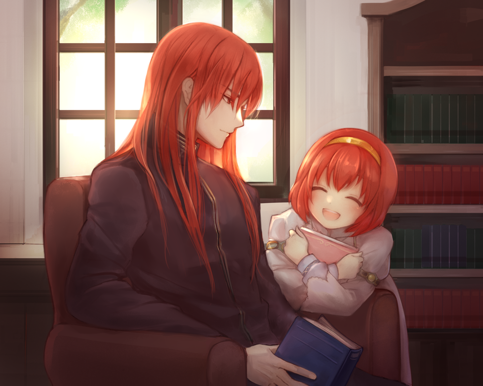 1boy 1girl :d armchair awning bad_id bad_pixiv_id black_coat book hugging_book bookshelf brother_and_sister chair coat dress closed_eyes eyes_visible_through_hair fire_emblem fire_emblem:_mystery_of_the_emblem hairband headband holding holding_book indoors long_hair long_sleeves looking_at_another maria_(fire_emblem) misheil_(fire_emblem) nintendo hugging_object open_book open_mouth potiko_(3110) red_eyes red_hair short_hair siblings sitting smile teeth tree upper_body white_dress window