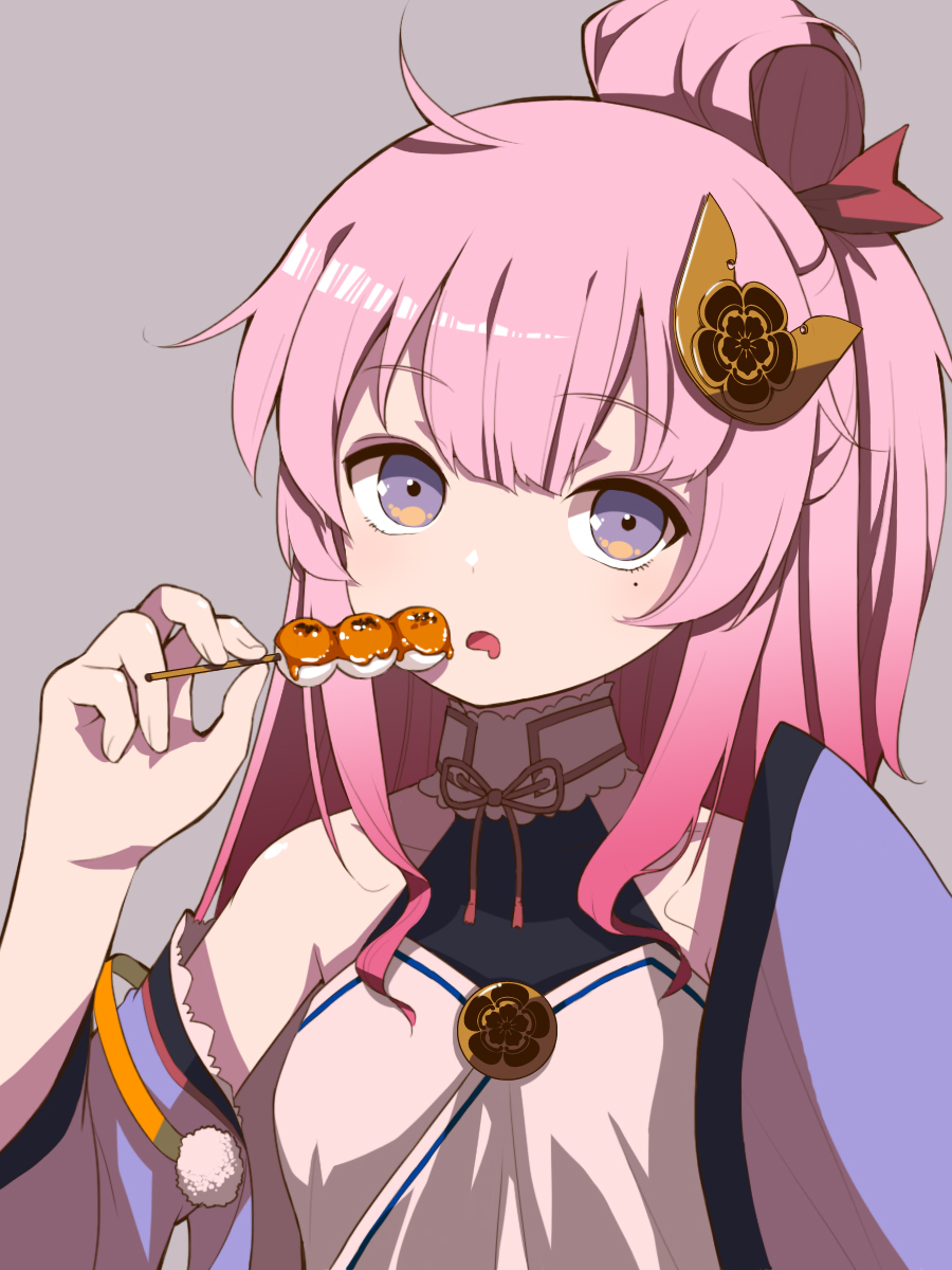 1girl bare_shoulders breasts commentary_request dango detached_sleeves dress drooling eating female_focus food grey_background hair_bun hair_ornament hanasaki hand_up haori highres holding holding_food indie_virtual_youtuber japanese_clothes long_hair looking_at_viewer mitarashi_dango mole mole_under_eye mouth_drool obi oda_nobuhime open_mouth pink_hair purple_eyes ribbon-trimmed_dress ribbon_trim sash sidelocks simple_background single_hair_bun skewer sleeveless sleeveless_dress small_breasts solo tagme upper_body virtual_youtuber wagashi wide_sleeves