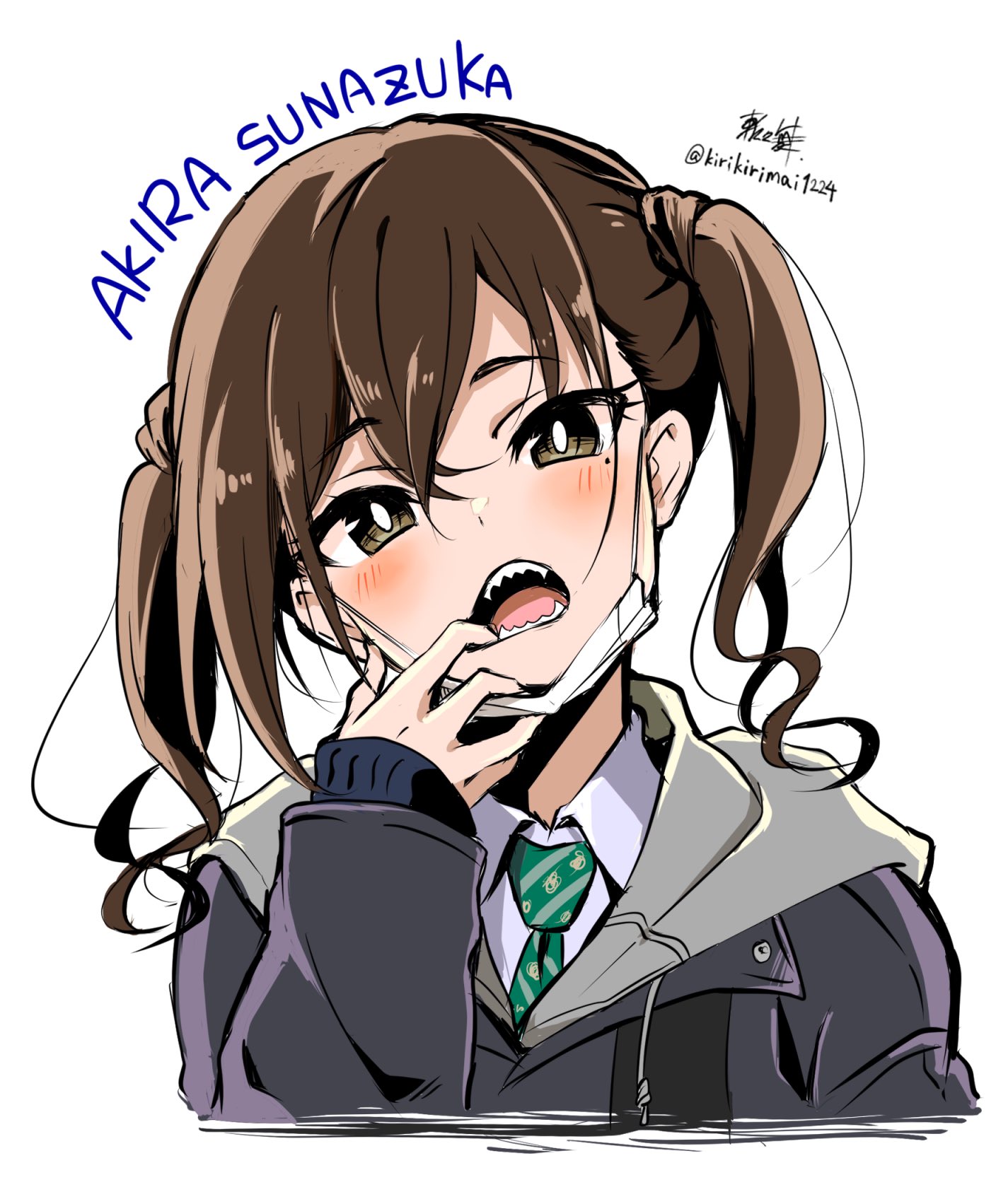 1girl blush brown_eyes brown_hair character_name commentary female_focus head_tilt highres hood hooded_jacket idolmaster idolmaster_cinderella_girls jacket kirikirimai_(kkm) long_sleeves mask medium_hair mole mole_under_eye mouth_mask necktie open_mouth sharp_teeth signature sketch sleeves_past_wrists solo sunazuka_akira surgical_mask teeth twintails twitter_username upper_body