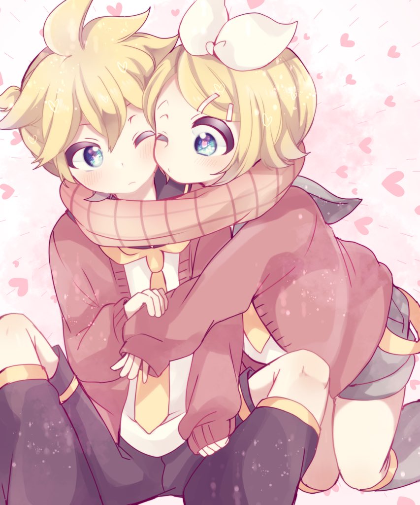 1boy 1girl aoi_choko_(aoichoco) bad_id bad_twitter_id blonde_hair blue_eyes bow brother_and_sister cheek-to-cheek commentary hair_bow hair_ornament hairclip heads_together heart heart-shaped_pupils heart_background hand_on_own_arm jacket kagamine_len kagamine_rin kneeling leg_warmers necktie one_eye_closed scarf shared_clothes shared_scarf short_hair shorts siblings sitting symbol-shaped_pupils twins vocaloid