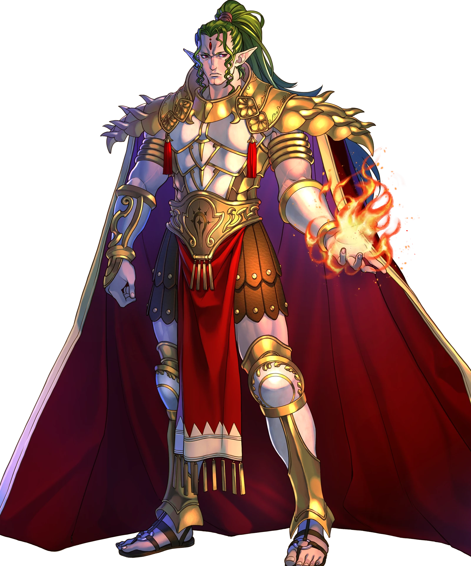 1boy armor cape duma_(fire_emblem) facial_mark fire fire_emblem fire_emblem_echoes:_shadows_of_valentia fire_emblem_heroes forehead_mark full_body highres long_hair male_focus manly nintendo official_art pointy_ears ponytail purple_eyes sandals solo transparent_background yoneko_okome99