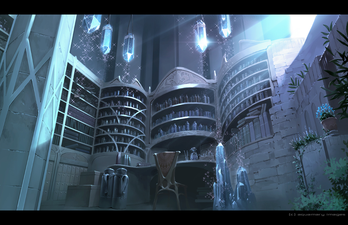 aquamary blue_theme book chair crystal desk flask flower indoors letterboxed no_humans original scenery shelf sparkle stone
