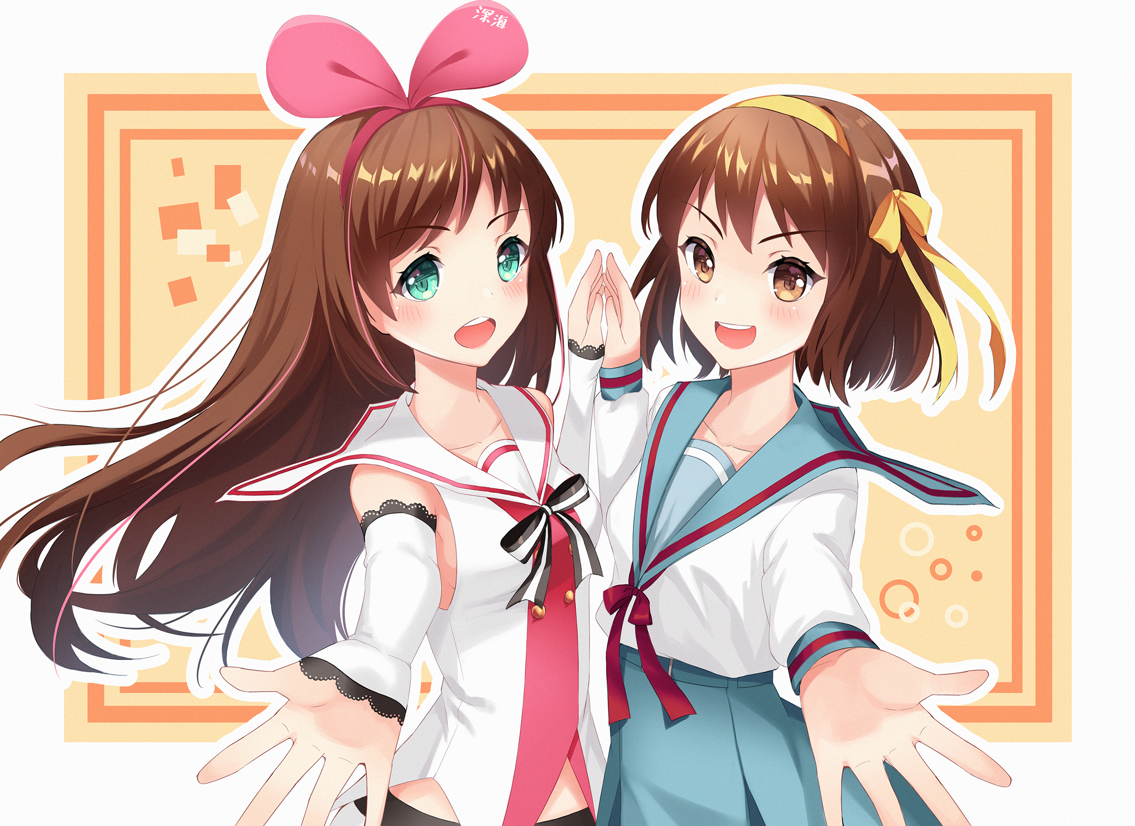 2girls bad_id bad_pixiv_id blue_sailor_collar blush brown_hair green_eyes hairband highres kita_high_school_uniform kizuna_ai kizuna_ai_(1st_costume) kizuna_ai_inc. long_hair looking_at_viewer multiple_girls orange_hairband pink_hairband sailor_collar school_uniform serafuku shinkai_kokoa short_hair smile suzumiya_haruhi suzumiya_haruhi_no_yuuutsu virtual_youtuber