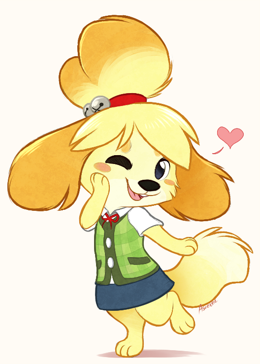 1girl :3 animal_crossing animal_ears animal_hands artist_name aseethe bad_furaffinity_link barefoot bell blonde_hair blue_eyes blue_skirt blush_stickers dog_ears dog_girl dog_tail female_focus flat_chest full_body furry furry_female green_vest hair_bell hair_ornament hair_tie hand_on_own_face hand_up happy heart isabelle_(animal_crossing) jingle_bell leg_up looking_at_viewer miniskirt neck_ribbon nintendo one_eye_closed open_mouth pencil_skirt pink_background plaid_clothes plaid_vest red_ribbon ribbon shirt short_hair short_sleeves signature simple_background skirt smile solo standing standing_on_one_leg tail teeth tongue topknot vest white_shirt wink