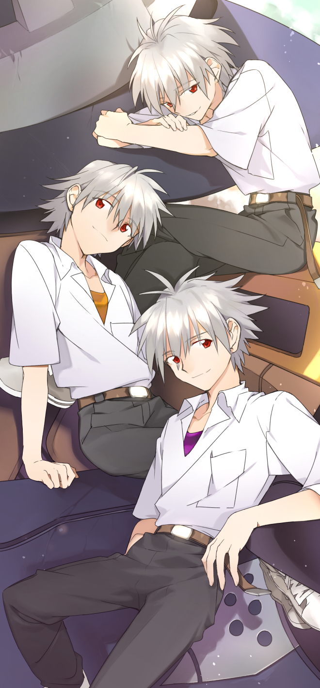 3boys bad_id bad_pixiv_id belt clone deilrimix grey_hair hair_between_eyes highres ikari_shinji looking_at_viewer male_focus multiple_boys multiple_persona nagisa_kaworu neon_genesis_evangelion pants red_eyes school_uniform shirt smile tokyo-3_middle_school_uniform