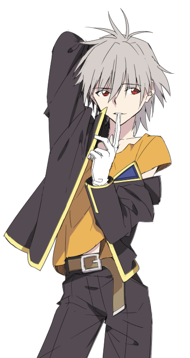 1boy bad_id bad_pixiv_id belt biting biting_clothes deilrimix gloves grey_hair male_focus nagisa_kaworu neon_genesis_evangelion red_eyes simple_background solo white_background white_gloves