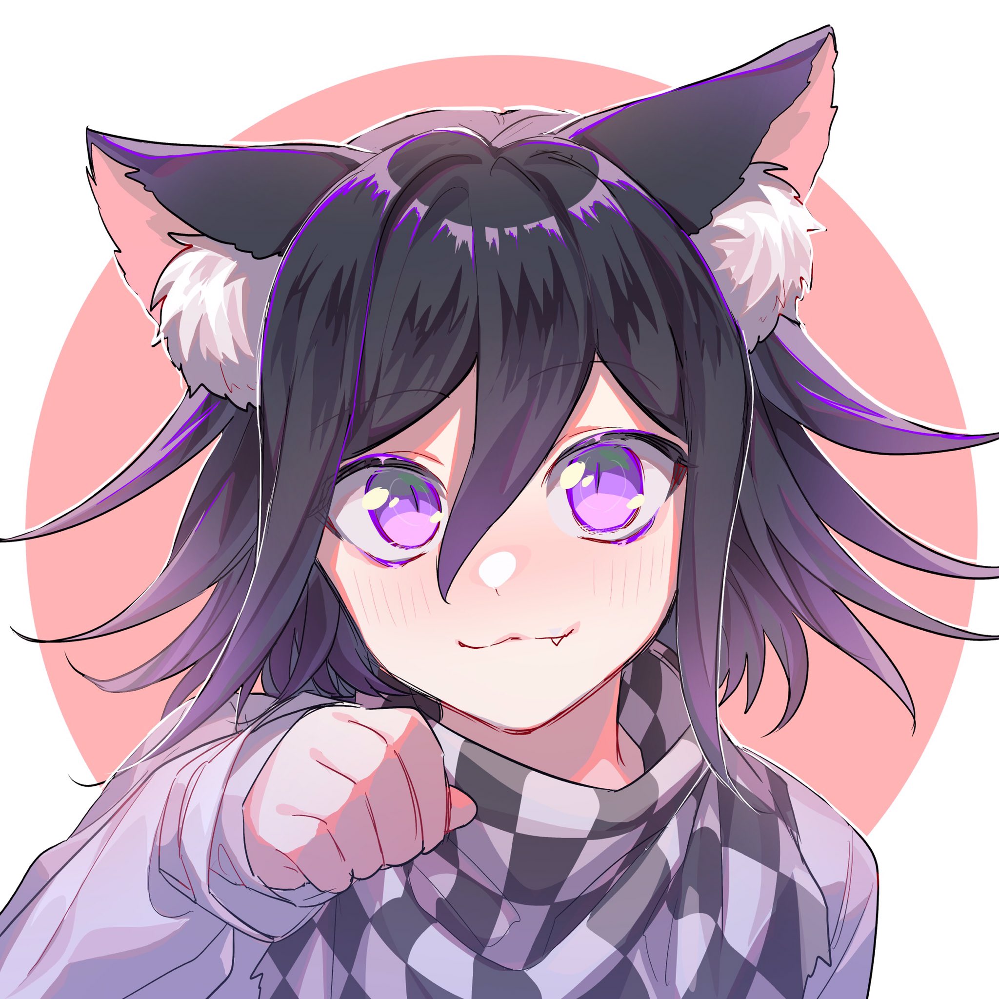 1boy :3 animal_ear_fluff animal_ears bad_id bad_twitter_id black_hair blush cat_ears checkered_clothes checkered_scarf commentary_request danganronpa_(series) danganronpa_v3:_killing_harmony dot_nose fang hair_between_eyes highres long_sleeves looking_at_viewer male_focus nanin oma_kokichi paw_pose portrait purple_eyes scarf short_hair simple_background sleeves_past_wrists smile solo straitjacket